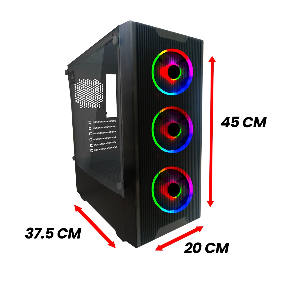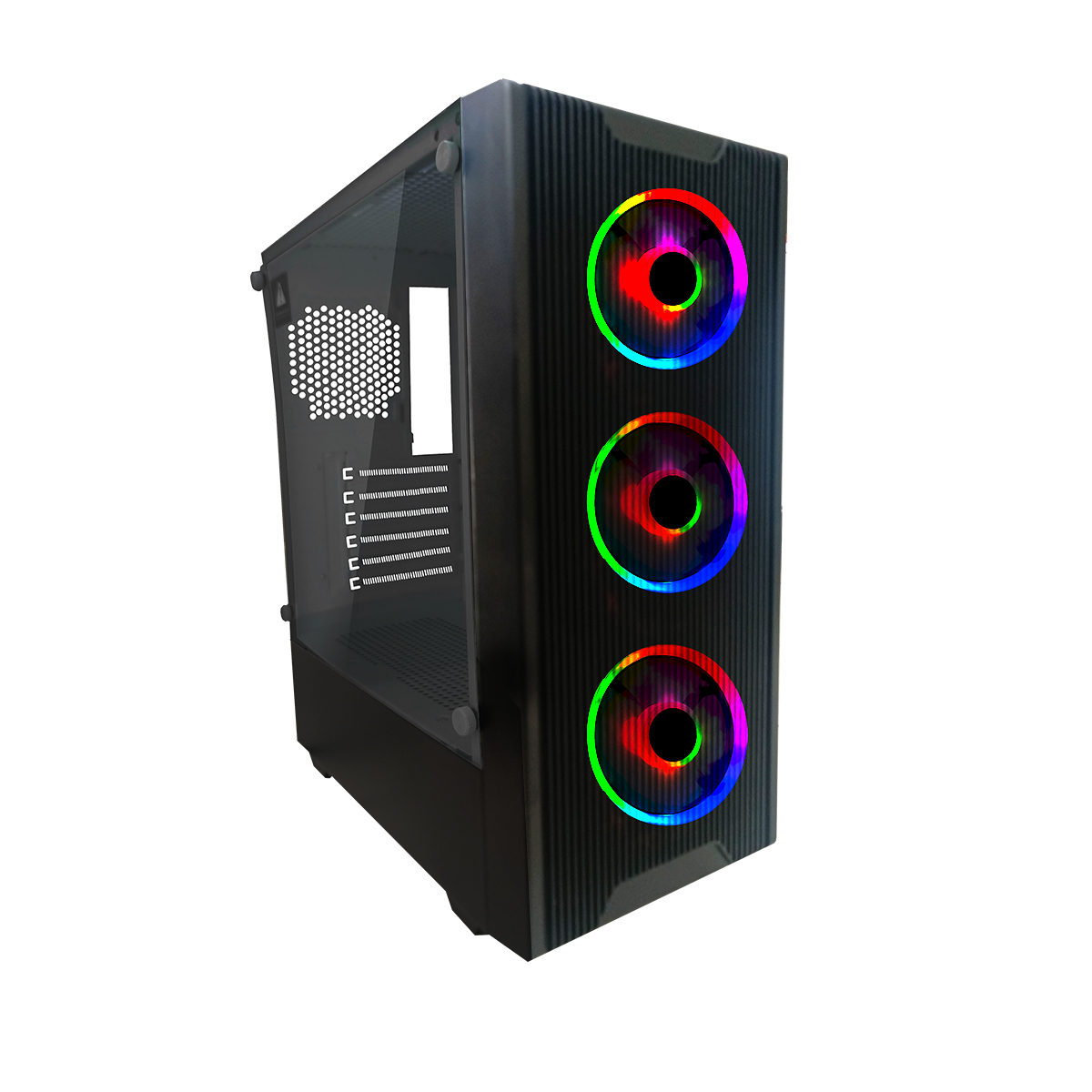 A sleek mid-tall case featuring dustproof ABS plastic mesh and a side panel made of tempered glass. Three RGB fans are pre-installed to keep your system cool and colorful. supports motherboards with lots of room for powerful components, like Micro-ATX and Mini-ITX.